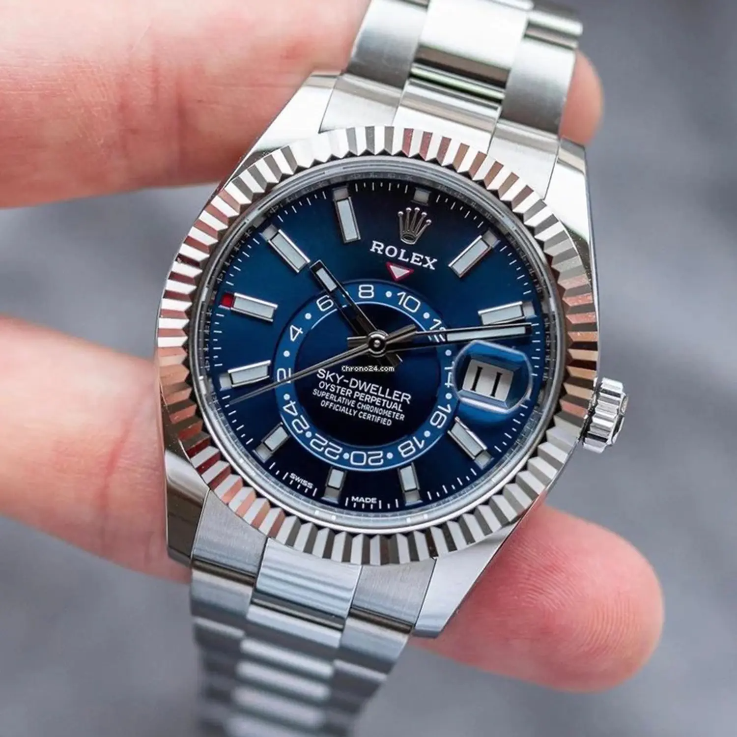 The Oyster Perpetual Sky‑Dweller in Oystersteel and white gold with a bright blue dial and an Oyster bracelet.