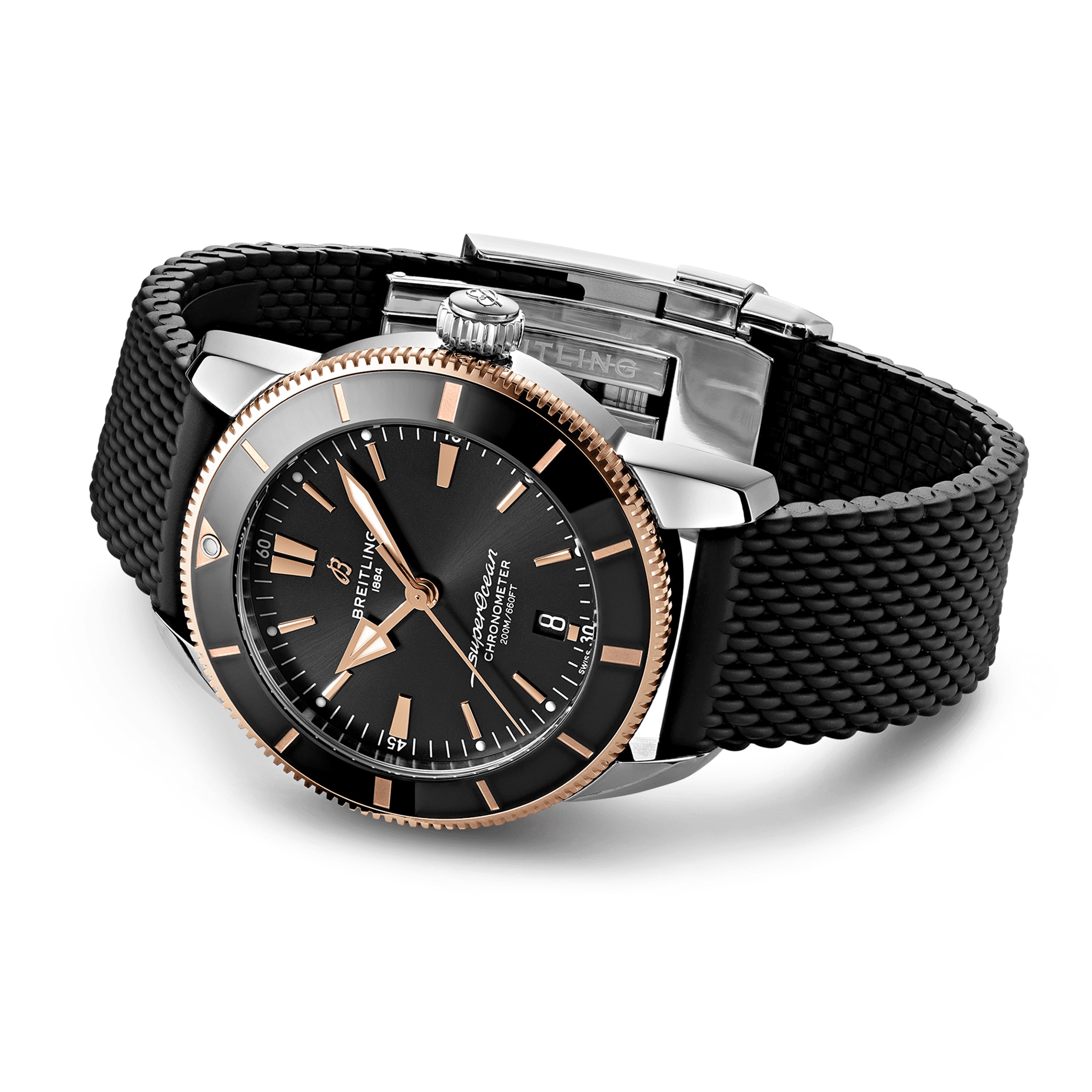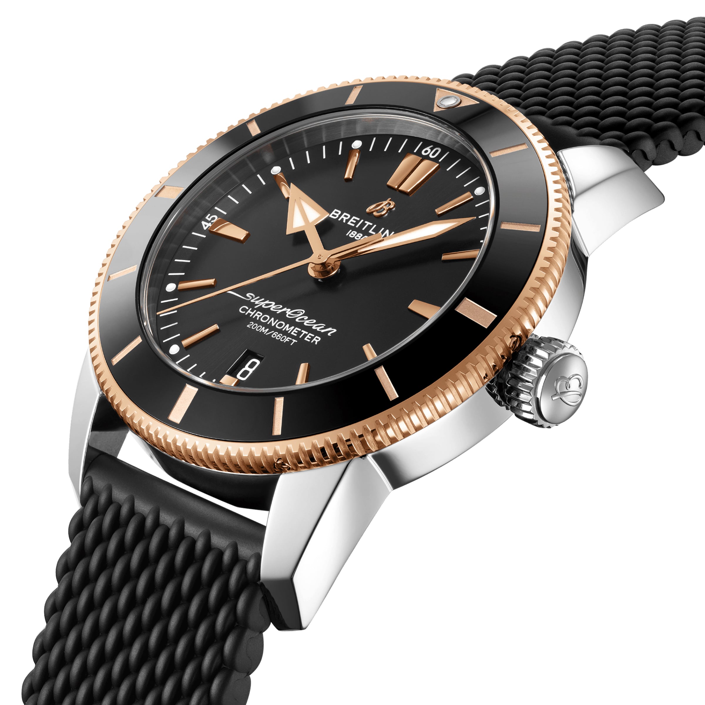 - A 44mm stainless steel and 18K red gold case with a black, mesh-style rubber bracelet