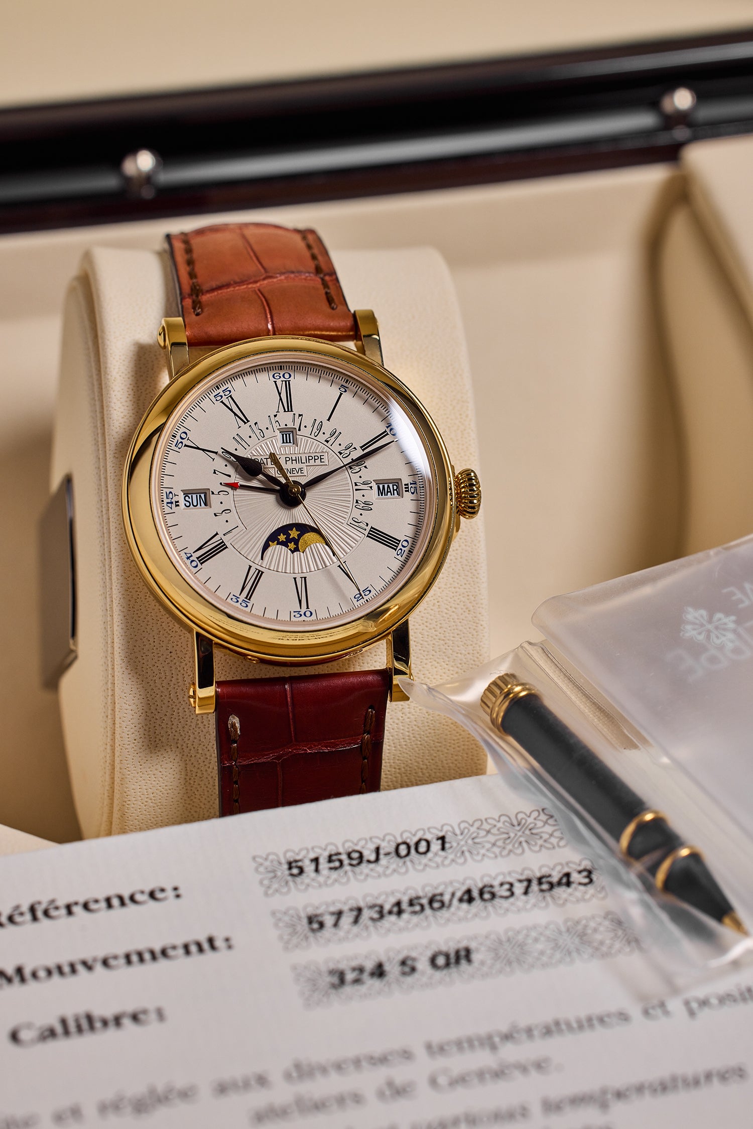 --The present example, from circa 2021, is offered in excellent condition and accompanied by the Certificate of Origin, setting pin and presentation box. The reference 5159J was discontinued in 2024, making this an opportunity to own a modern classic with all the refinements of early-twentieth century design encasing the finest mechanics of the modern era.