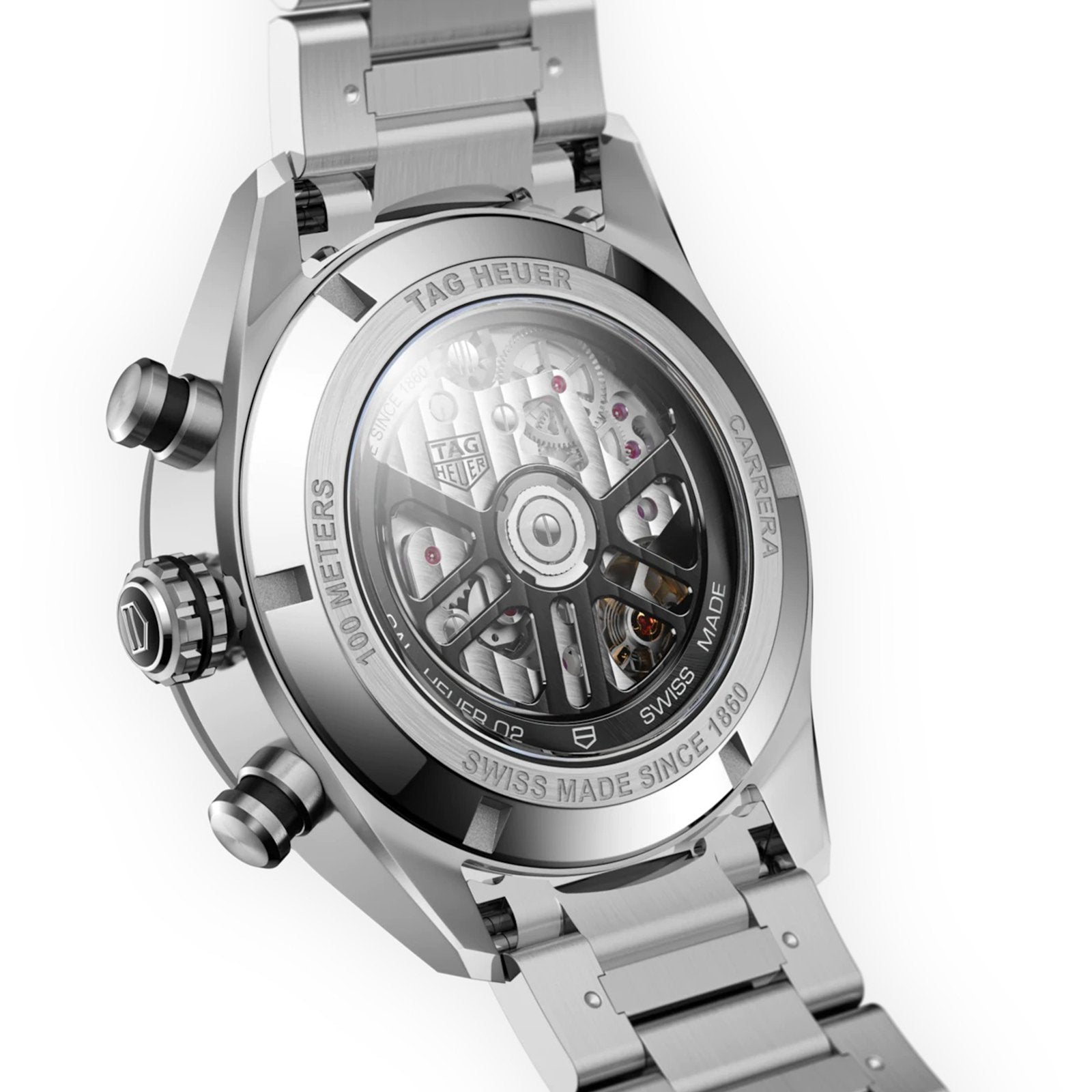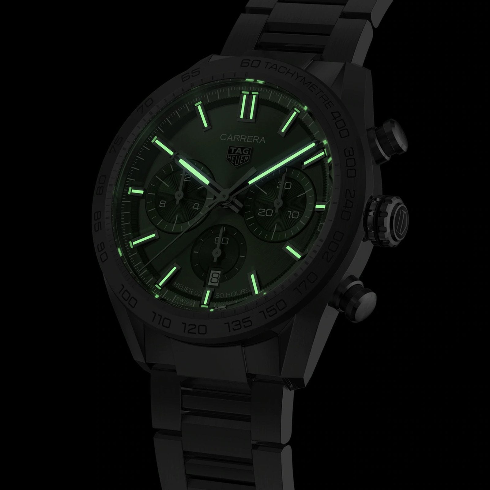 A TAG Heuer Carrera chronograph with all the prestige of its motor-racing heritage. With 44-mm fine-brushed and polished steel case, our manufacture Heuer 02 automatic movement and trendy green brushed dial, punctuated witha second indicator and two green chronograph counters, makes for unbeatable functional style.