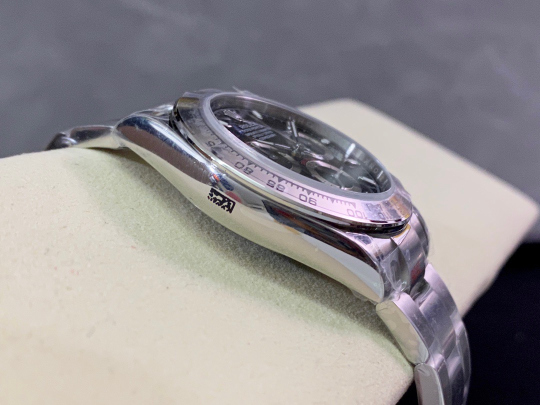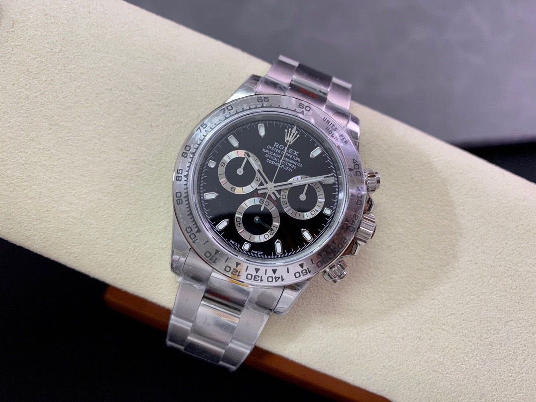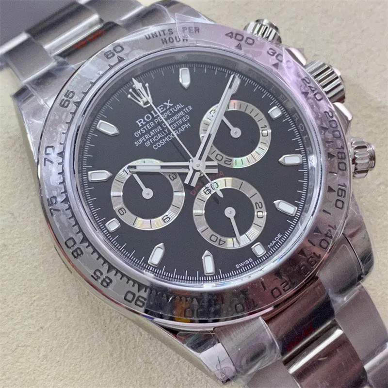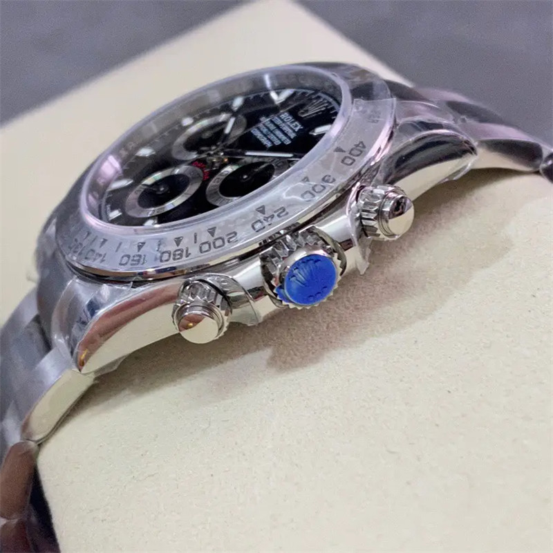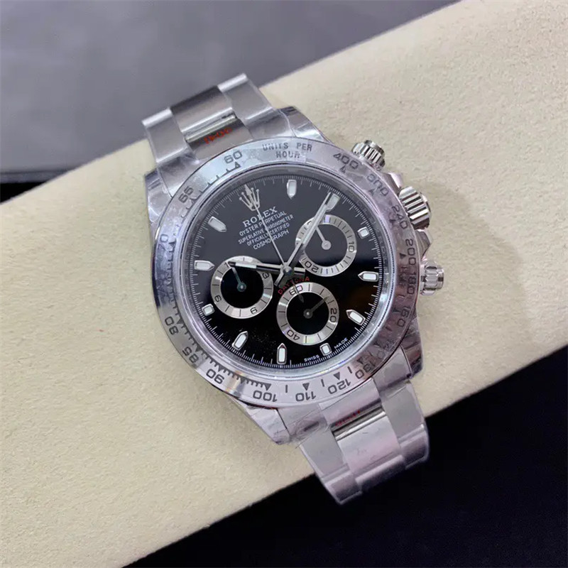 Daytona Swiss replica watches looks and function identical to a genuine Rolex. Our Swiss cloned Rolex chronograph movements feature every Rolex engraving, serial numbering and are lubed with Nano-oil Swiss lubricants and are designed to last a lifetime. Visually and functionally our chronograph movement 28.000 vibrations per hour offers the same fine sweep seconds hand “Rolex” motion as on the genuine Rolex. Our chronograph sub dials displays the seconds, minutes, hours and both screws down buttons are fully functional for the chronograph start-pause-stop functions.