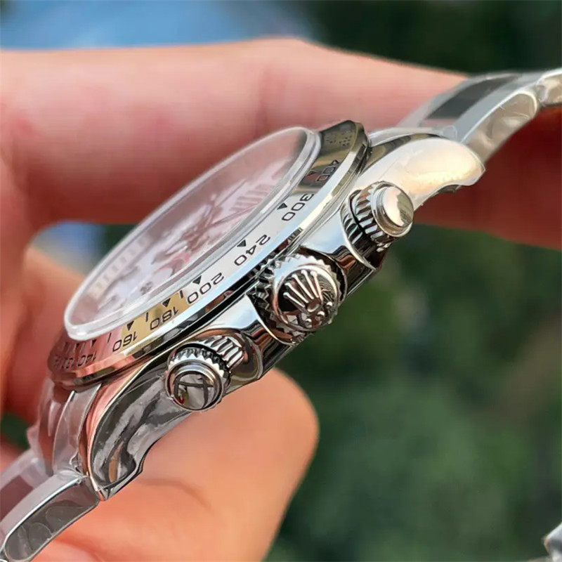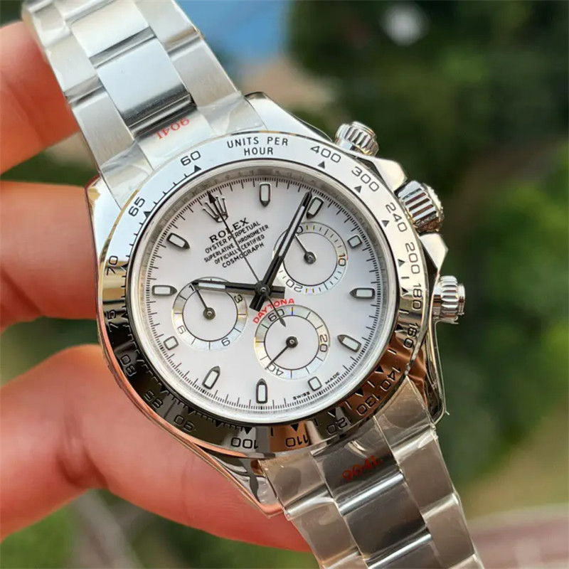 Daytona Swiss replica watches looks and function identical to a genuine Rolex. Our Swiss cloned Rolex chronograph movements feature every Rolex engraving, serial numbering and are lubed with Nano-oil Swiss lubricants and are designed to last a lifetime. Visually and functionally our chronograph movement 28.000 vibrations per hour offers the same fine sweep seconds hand “Rolex” motion as on the genuine Rolex. Our chronograph sub dials displays the seconds, minutes, hours and both screws down buttons are fully functional for the chronograph start-pause-stop functions.