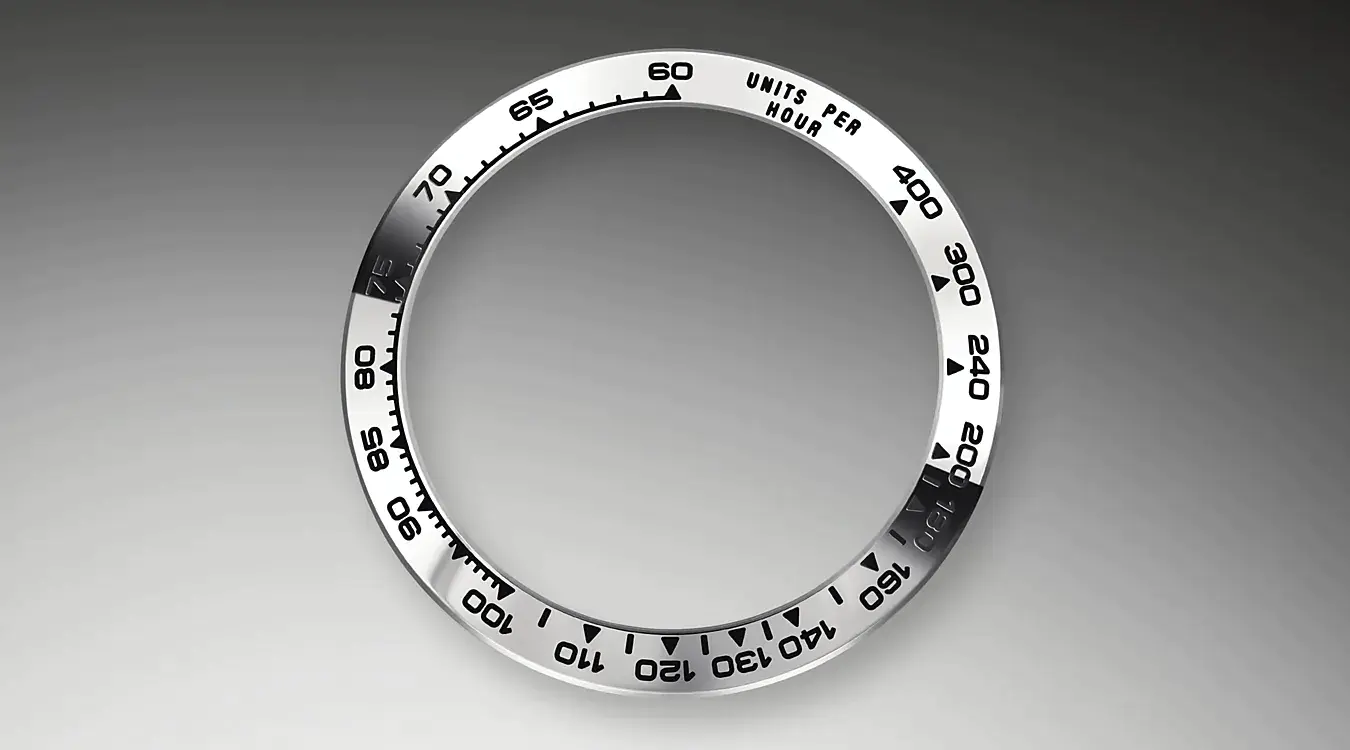 With its tachymetric scale, its three counters and its pushers, the Cosmograph Daytona was designed to be the ultimate timing tool for endurance racing drivers. The bezel features a tachymetric scale to read average speed over a given distance based on elapsed time. This scale offers optimal legibility, making the Cosmograph Daytona the ideal instrument for measuring speeds up to 400 units per hour, expressed in kilometres or miles.