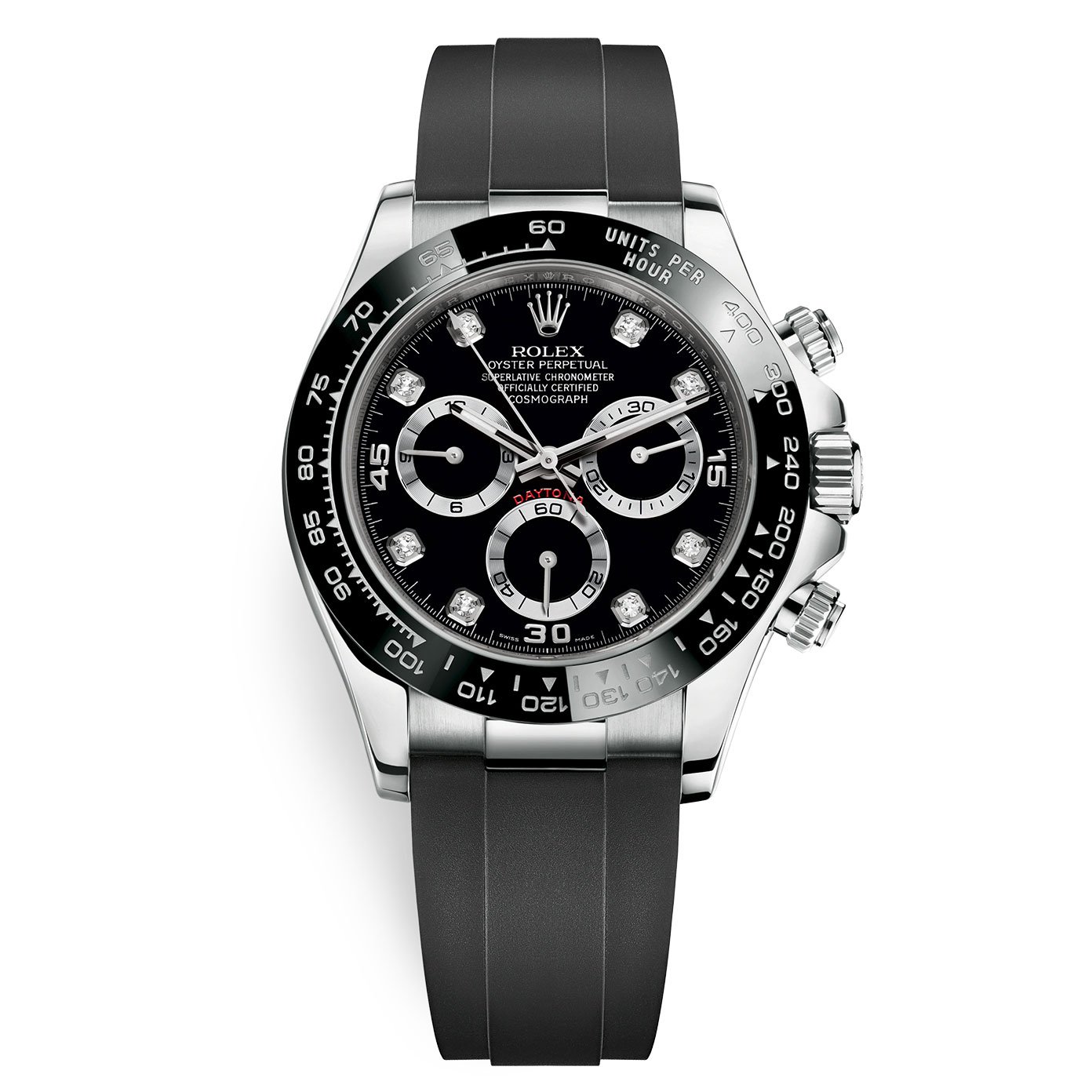 The Daytona’s chronograph feature functions are activated by pushers that screw down like the winding crown when they are not in use, guaranteeing waterproofness to 100 metres. One press to start, stop or reset the chronograph produces a crisp, clear click that was perfected using the most advanced technology. watchmakers also perfected the mechanism to suit the ideal finger pressure on the pushers, and engineered it to provide an instantaneous and accurate start to the timing without sacrificing reliability.