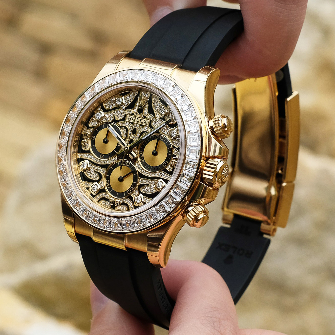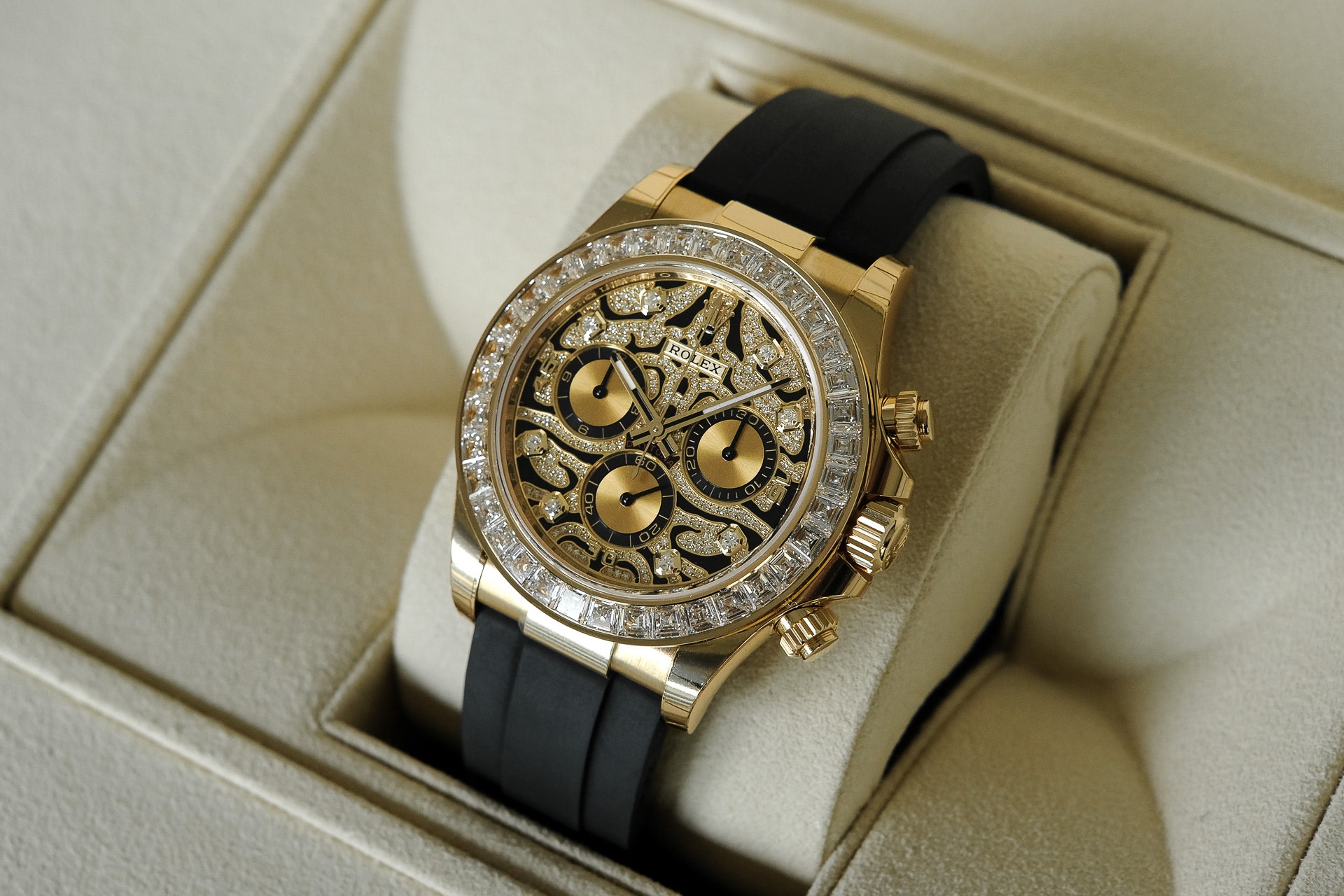 A Rolex Daytona with diamonds is not something new but one with a dial like the 116588TBR sure is! The black-lacquered dial has an applied 18k yellow-gold and diamond-set, wavy structure on the surface, which can remind you of a tiger's fur.